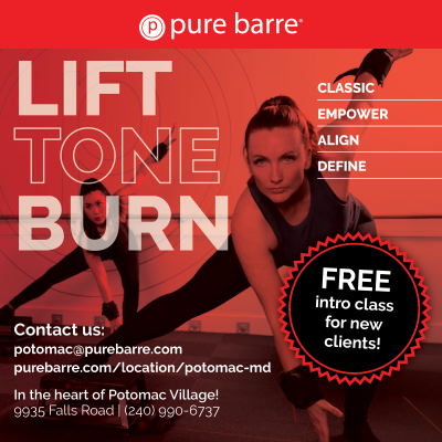 Come lift, tone, and burn in our high-energy, musically driven barre classes. Located in Potomac Village off Falls Road, we offer four different formats focused on strength, flexibility, cardio, balance & power. Every class is a low-impact, high-intensity, full-body workout designed to work each muscle group to fatigue. Build strength & endurance with safe & proper form in our encouraging community. Barre is for all ages & levels of fitness. Try your first class with us for free. 9935 Falls Road.