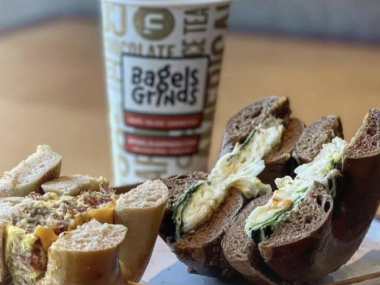Potomac’s newest restaurant, Bagels ‘n Grinds, made its debut this week next door to the newly renamed Potomac Pizza Grill. Owner Adam Greenberg envisions the adjoining eateries as a morning-to-evening gathering spot for the Village, shifting from bagels, salads, sandwiches, pizza and coffee to evening dinner and cocktails. The two eateries have separate entrances but they’re connected in the back, so daytime customers can order from either menu and sit on either side. By night, the entire space transforms into a full-service restaurant with a brand new bar. The bagel side features a glassed-in showcase for its special water filtration system, designed to mimic the “secret ingredient” of New York City bagels. There are charging outlets at every table, both inside and outside, and customers can help themselves to unlimited refills from the expansive self-serve coffee bar. Bagels ‘n Grinds also offers made-to-order espressos, cappuccinos and smoothies.