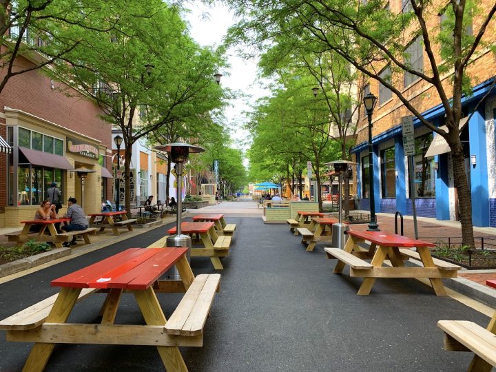 Nearly a year after downtown Bethesda launched a “Streetery” for outdoor dining, Rockville Town Square is following suit. Gibbs Street, home to First Watch, Lebanese Taverna, Five Guys and Marble Slab Creamery, is now closed to traffic and covered with colorful picnic tables and “dining pods.” Coming soon to the lineup: Mexican restaurant Plaza Oaxaca, scheduled to open May 8th in the former La Tasca space. For more photos of Rockville’s new Streetery, check out Store Reporter on Facebook and Instagram.